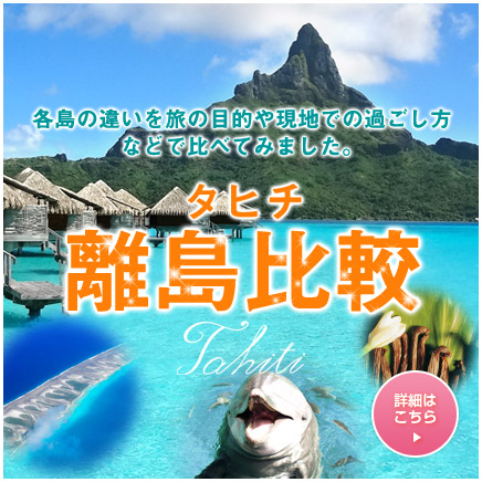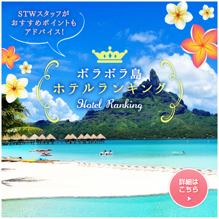 タヒチは118もの島が集まる、フランス統治の南太平洋の楽園です。 ゴーギャンも愛した最後の楽園タヒチは1年を通して温暖な気候に恵まれ、鮮やかな海の青と豊かな森林の緑、そして眩しく降り注ぐ太陽の光がタヒチの魅力です。 神々しいオテマヌ山がそびえたつ「ボラボラ島」、イルカと触れ合えるハート型の可愛い島「モーレア島」、ダイビングに絶大な人気の「ランギロア島」、未知の世界を体感できる「イースター島」などに訪れるツアーや3島周遊ツアーなど幅広いタヒチ旅行ツアーをご用意しております。 その中でもおすすめは、ハネムーンのお客様に人気のブルーラグーンに囲まれた水上コテージに宿泊するコース。 弊社タヒチ担当は現地視察済みですので、お客様にあった水上コテージやホテルカテゴリーのご提案や宿泊・ツアープランをご紹介させて頂きます。 ボラボラ島、モーレア島、ランギロア島などタヒチ離島のツアーもあります。 タヒチの海外旅行・ツアーならエス・ティー・ワールド(STW)へ! タヒチの海外旅行・ツアーのプランを多数ご用意しております。