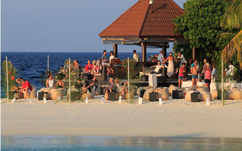 サンセット時にはバーにお越しください。美しい砂州の向こうに日が沈む美しい光景がご覧になれます。カナッペ無料配布中。