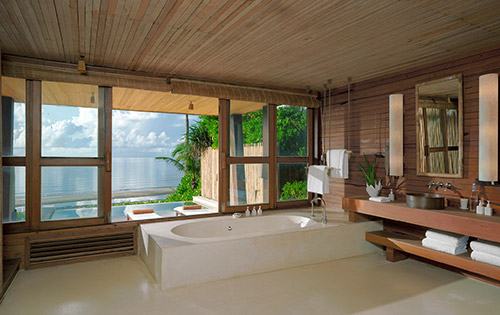 平屋作りのデラックスプールヴィラはベッドの目の前にプールとビーチが広がり、ベッドルームの裏側にバスルームが設けられています。 1フロアにベッドルームとバスルームを機能的にまとめつつ、空間的にも広々感じる素敵なヴィラ設計。 ベッドルームから海への距離感も抜群で、朝目を覚まして大きな窓を抜けてそのままビーチへ飛びたしたくなるような解放感が魅力です。