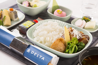 デルタ航空はエコノミークラスでも「一汁二菜うえの」の上野法男シェフ考案・監修による和食メニューや、