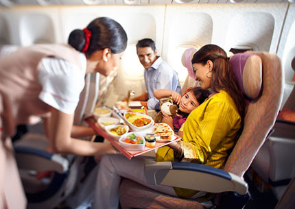 ビジネスクラスでは健康志向の料理に舌つづみ。シャンパンも無料サービス。 ビジネスクラス向けに、エミレーツが誇る敏腕シェフが、各種の健康食メニューをご用意しております。食材本来の風味と栄養分を活かしつつ、飽和脂肪酸やトランス脂肪酸、塩分や糖分を抑えています。ロイヤル・ドルトンの食器 (ファイン・ボーン・チャイナ)、ロバート・ウェルチのフォークやナイフで饗します。いずれの食事でも、シャンパンや極上のワイン、カクテルその他のお飲み物は無料です。(ただし、サウジアラビア路線ではアルコール類は提供されまん。)数々の受賞実績のある洗練されたお食事と素晴らしいサービスを、ゆったりとおくつろぎながらお楽しみください。